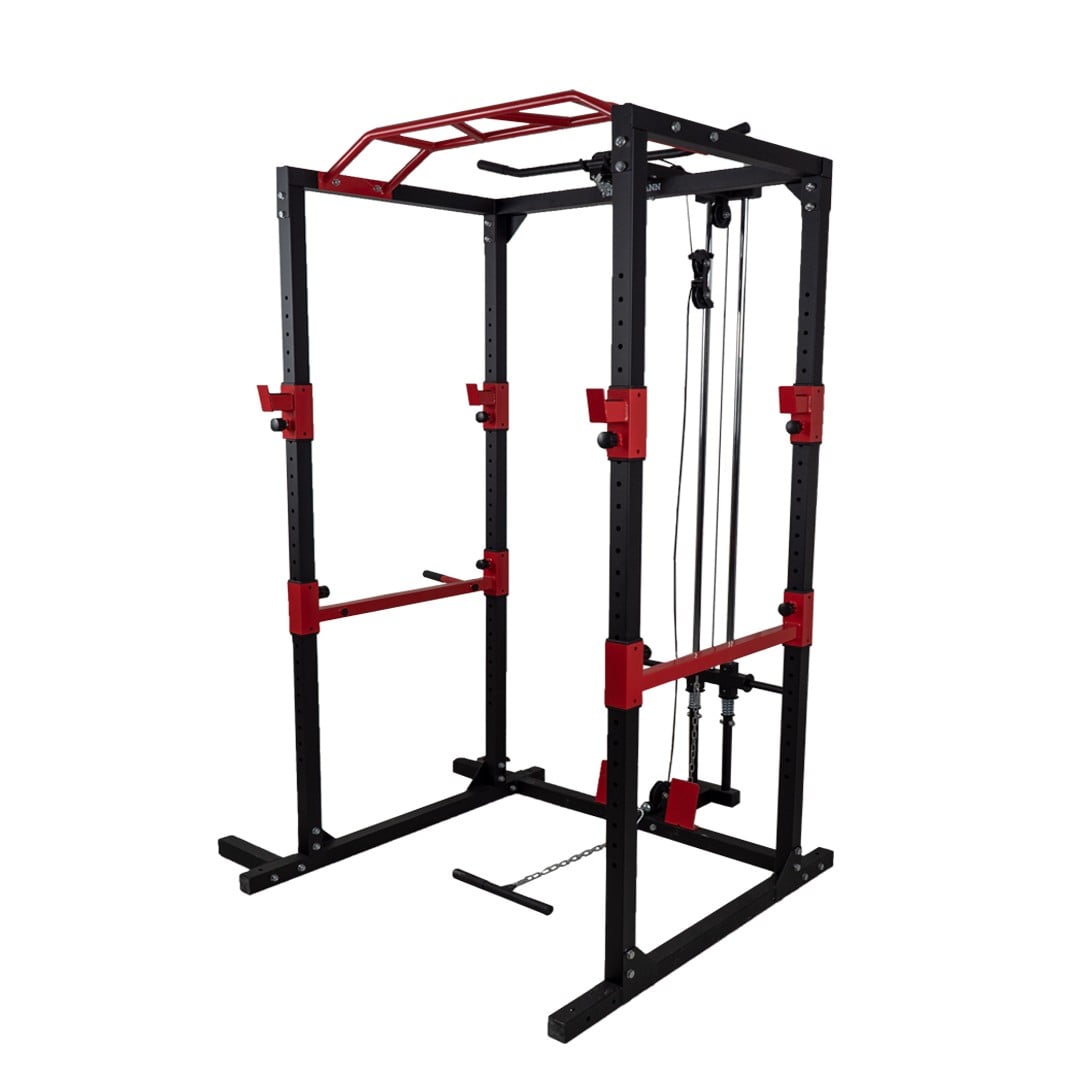 Acest power rack va permite sa efectuati flotari din picioare si genuflexiuni cu bara de haltere fara un observator, fara a va pune in pericol siguranta. Opritoarele de siguranta pentru bara de haltere pot fi reglate in diferite pozitii in functie de nevoile dvs., ceea ce face ca power rack-ul sa fie potrivit pentru utilizatorii de toate inaltimile. Sistemul de scripeti care utilizeaza discuri de greutate pentru a regla sarcina este perfect pentru a va intari spatele, umerii si bratele, in timp ce bara solida pentru tractiuni cu mai multe manere este perfecta pentru un antrenament eficient cu greutatea corporala. Manerele paralele reglabile pe inaltime va vor extinde optiunile de exercitii.