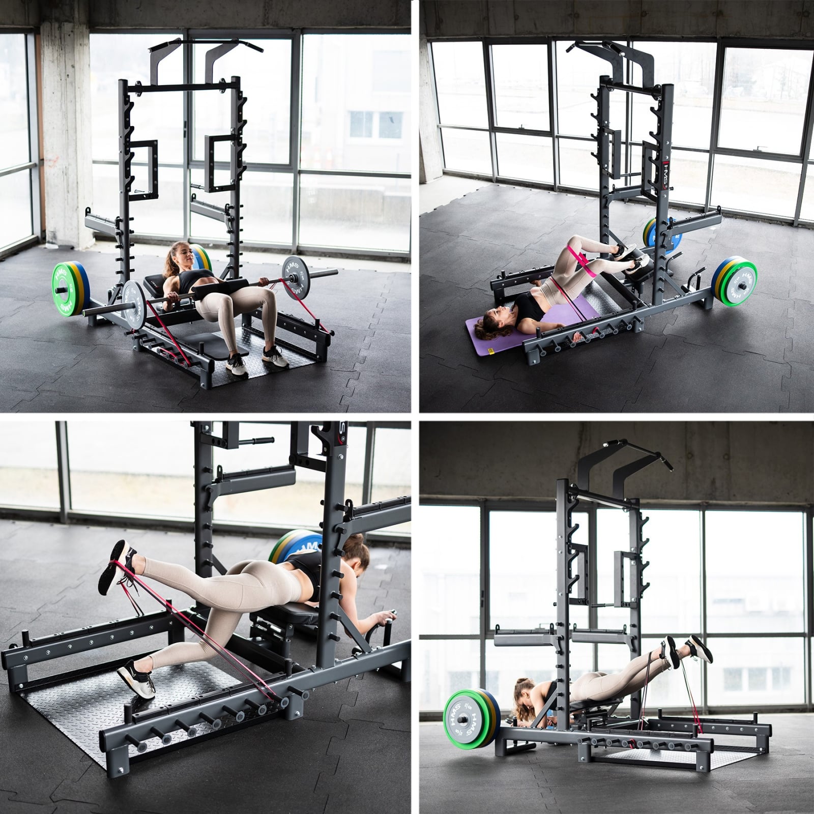 Echipamentul multifunctional SMP01 este prevazut cu o platforma antiderapanta care ofera stabilitate la efectuarea exercitiilor dinamice. Covorasul inclus mareste confortul, protejandu-ti spatele in timpul impingerii soldurilor si a altor exercitii in decubit dorsal.
