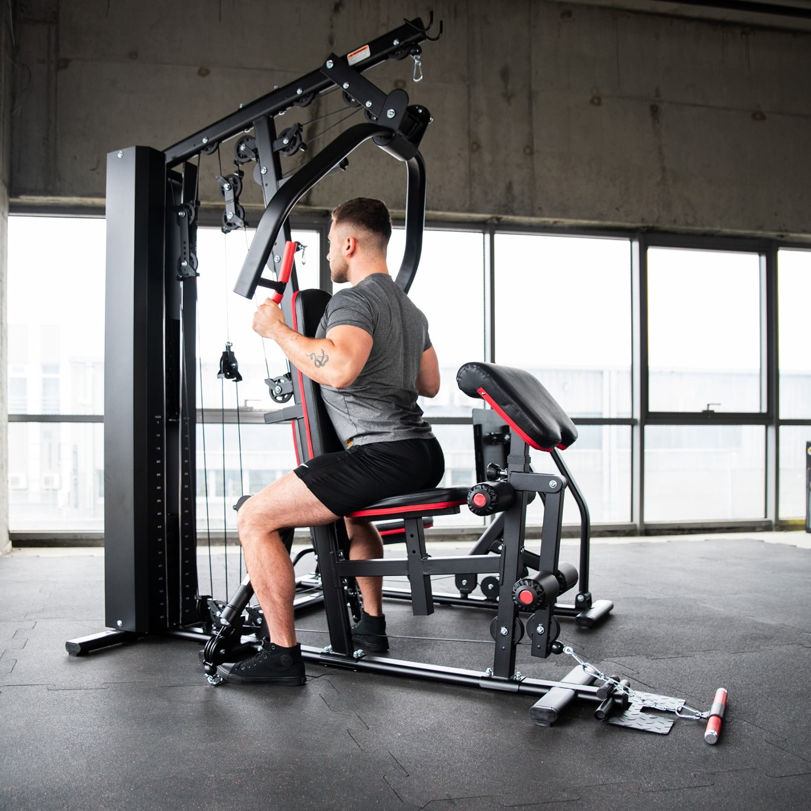 Aparatul este echipat cu o stiva de greutati de 80 kg care poate fi ajustata in trepte de 5 kg, permitandu-va sa reglati sarcina pentru a se potrivi nevoilor dumneavoastra. Cei trei scripeti - superior, mijlociu si inferior - va ofera posibilitatea sa efectuati o varietate de exercitii care vor implica in mod eficient multe parti ale corpului.