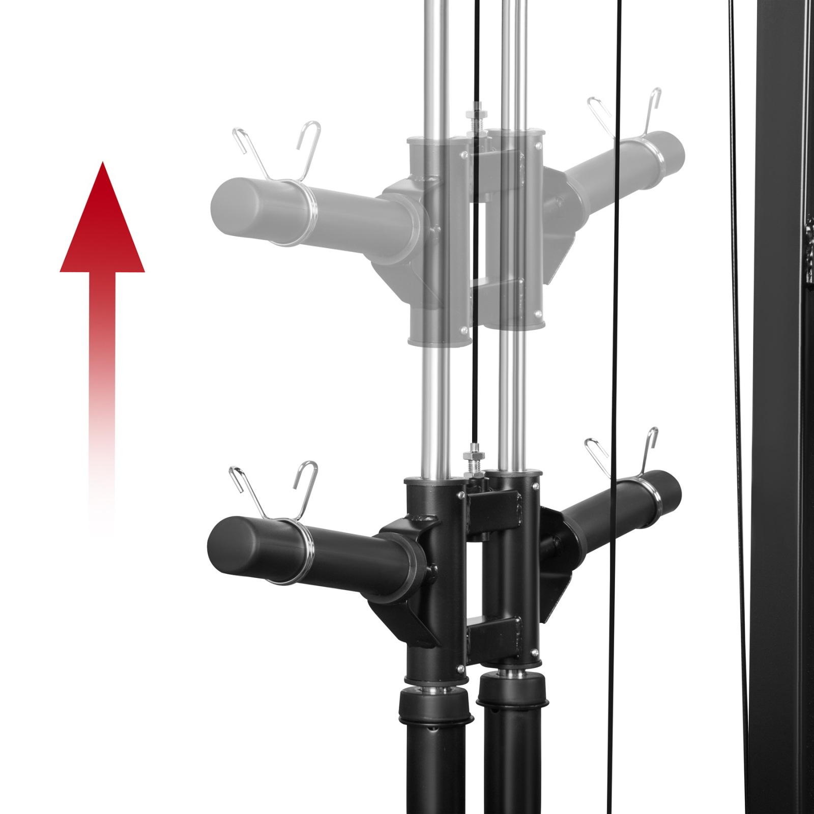 Ghidajele din otel inoxidabil asigura rigiditate ridicata si o miscare extrem de fluida a barei. Sistemul de siguranta cu carlige din otel permite blocarea rapida si sigura a barei la orice nivel.