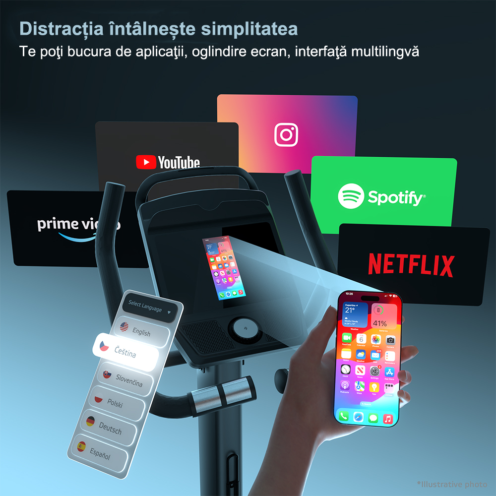 Antrenamentul intalneste distractiaConsola inteligenta aduce o noua dimensiune antrenamentelor de acasa. Suporta screen mirroring pentru mobil, optiuni de limba in ceha, slovaca si poloneza, precum si aplicatii de divertisment care transforma antrenamentul intr-o experienta placuta. Poti conecta si casti Bluetooth pentru a urmari Netflix sau YouTube fara sa-i deranjezi pe ceilalti – doar incepi sa pedalezi si emisiunea preferata ruleaza alaturi de tine!