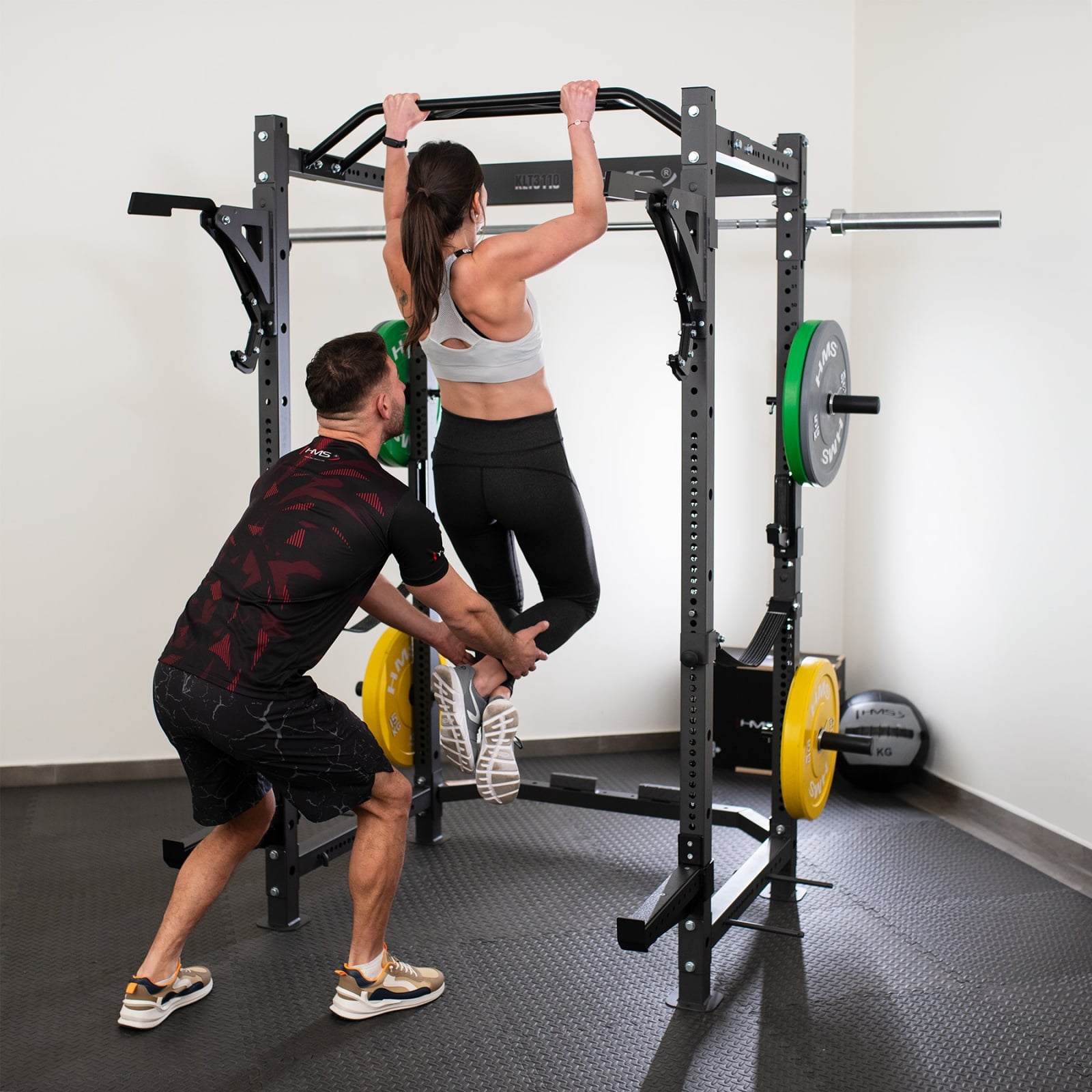 Power Rack are multe functii si optiuni de reglare care il fac universal si adaptat nevoilor individuale ale utilizatorului. Puteti efectua diverse exercitii pe el, cum ar fi tractiuni, genuflexiuni, bench press, deadlift si multe altele. Produsul va permite, de asemenea, sa adaugati un plus de diversitate la exercitii, datorita benzilor elastice care pot fi atasate de bare speciale.