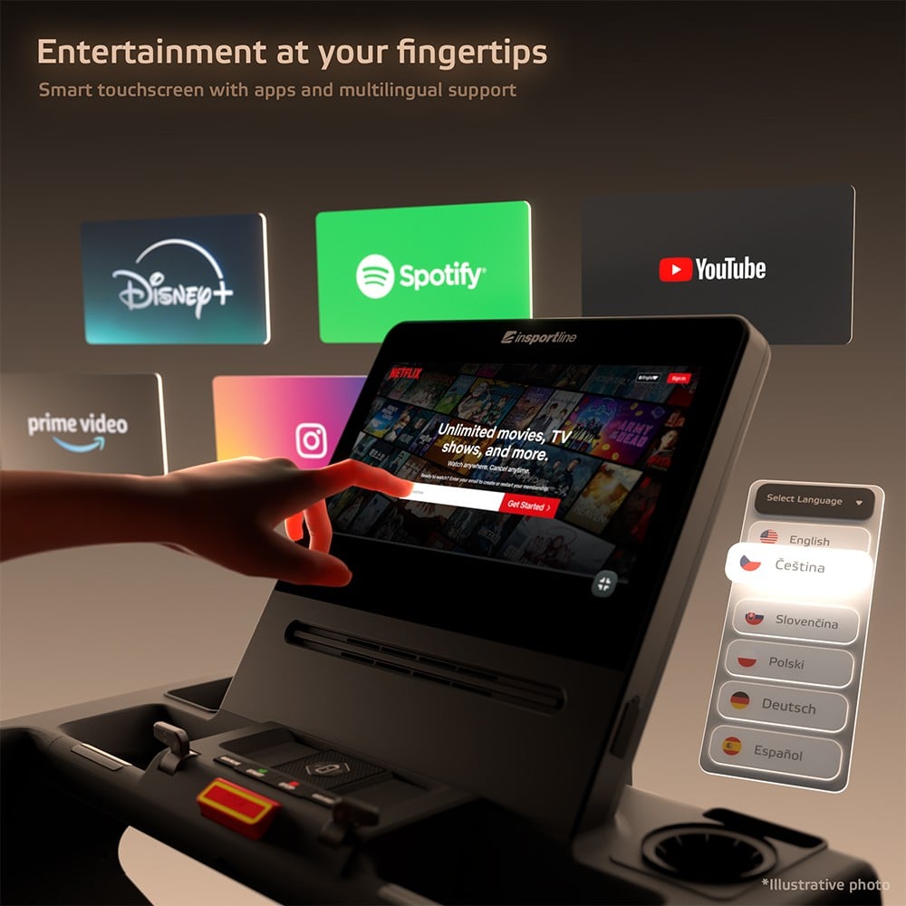 Consola moderna ofera mult mai mult decat datele de baza ale antrenamentului. Poti viziona YouTube sau Netflix, sau sa conectezi casti Bluetooth si sa alergi pe muzica ta preferata. Datorita suportului pentru centura toracica Bluetooth (centura nu este inclusa), poti monitoriza ritmul cardiac cu precizie si sa profiti de programele HRC, care ajusteaza automat intensitatea in functie de performanta ta. Nu gasesti aplicatia preferata? Pur si simplu oglindeste ecranul smartphone-ului pe display-ul mare TFT touchscreen.