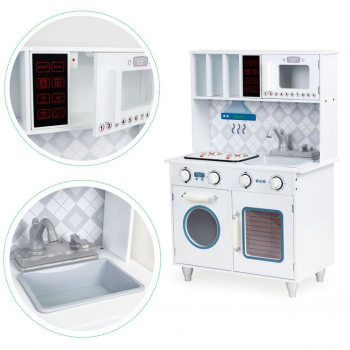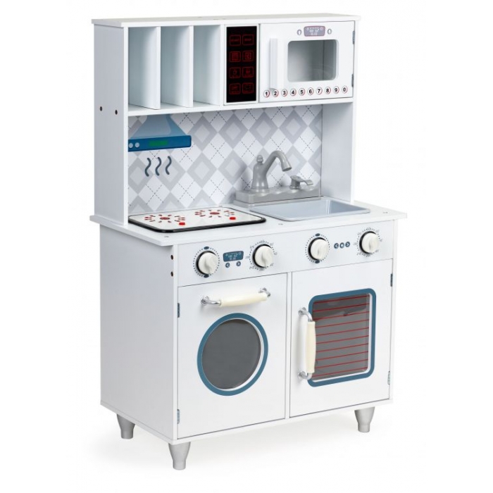 Tuturor copiilor le place sa imite adultii, iar datorita acestei bucatarii copilul tau va avea ocazia sa joace rolul unui bucatar. La dispozitia bucatarului se afla arzatoare cu butoane - pentru a seta temperatura corespunzatoare + sunetul apei clocotite. Un cuptor si o masina de spalat vase sunt situate sub blatul de lucru. In partea superioara exista un cuptor cu microunde care se deschide si un raft suplimentar pentru ustensile.