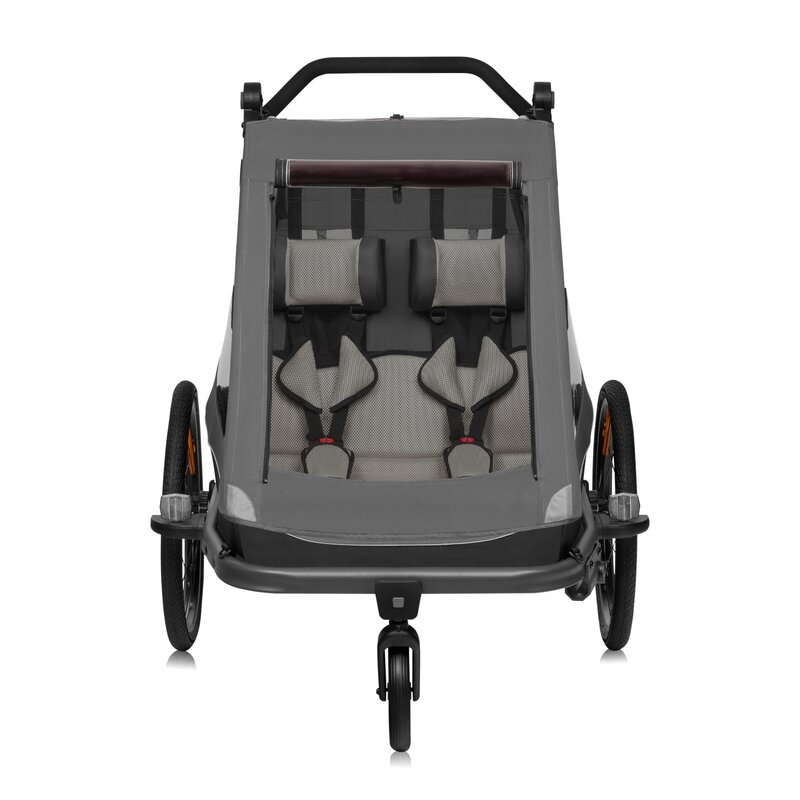 Pe de alta parte, confortul bebelusului este asigurat de sistemul special Head+, care ofera posibilitatea inclinarii libere a capului - de exemplu, in timpul unui pui de somn. Tapiteria cu filtru UPF50+, invelis impermeabil pentru a proteja impotriva umezelii si ferestrele si capacul frontal din folie colorata fac ca remorca sa poata fi utilizata in aproape orice conditii meteorologice. Sistemul avansat All-Round-Safety asigura siguranta in timpul calatoriei, care nu numai ca protejeaza impotriva impactului, ci asigura si o buna vizibilitate dupa lasarea intunericului.