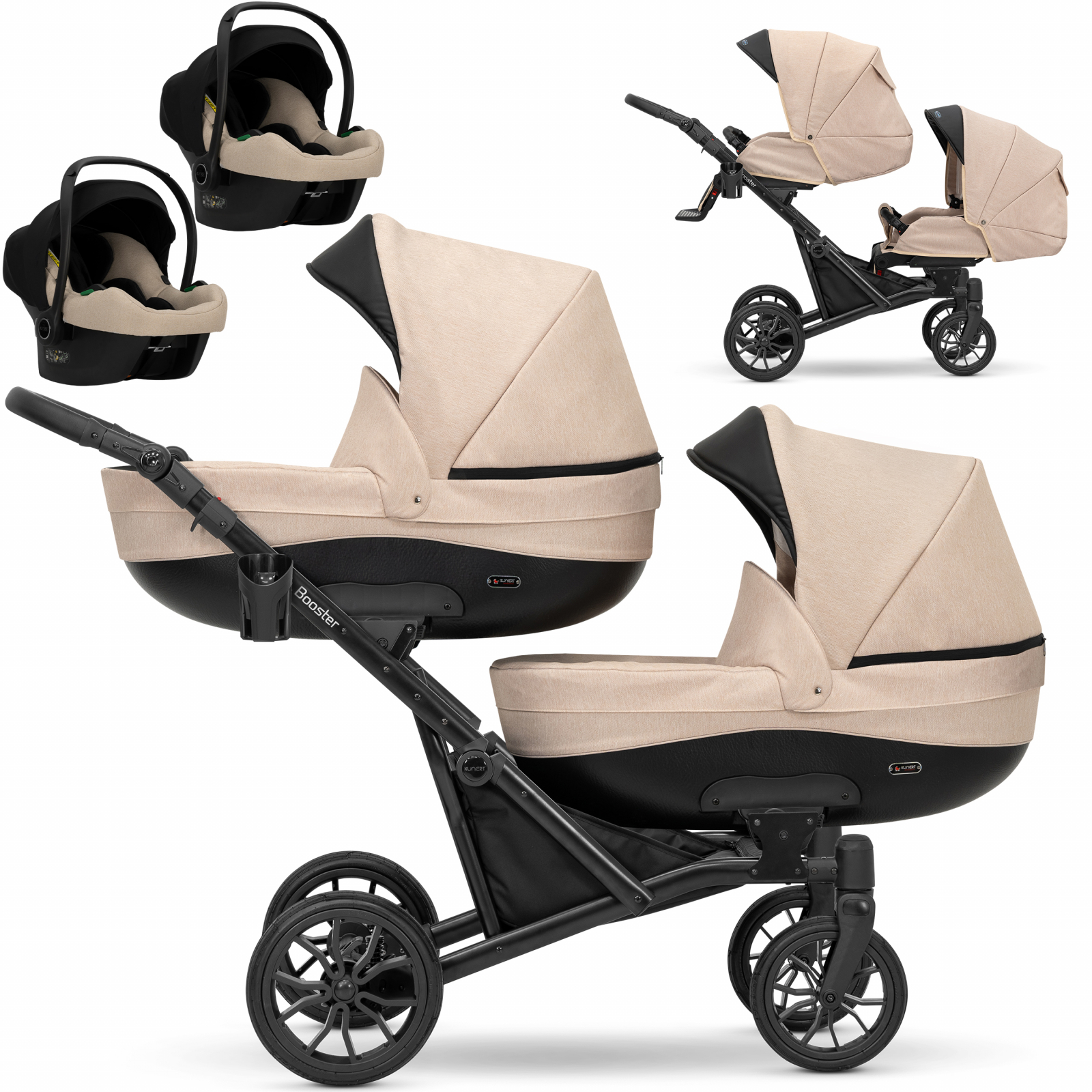 Caruciorul pentru gemeni Booster are o constructie stabila si echilibrata. Forma alungita, cu copiii pozitionati fata in fata, il face agil si usor de condus, iar configuratia flexibila a scaunelor, landourilor si cosurilor auto il fac universal si functional. Caruciorul are suspensii, maner ajustabil, un cos de cumparaturi generos si geanta mamicii. Setul contine doua landouri, doua scaune sport si cate doua huse de ploaie, respectiv impotriva insectelor.