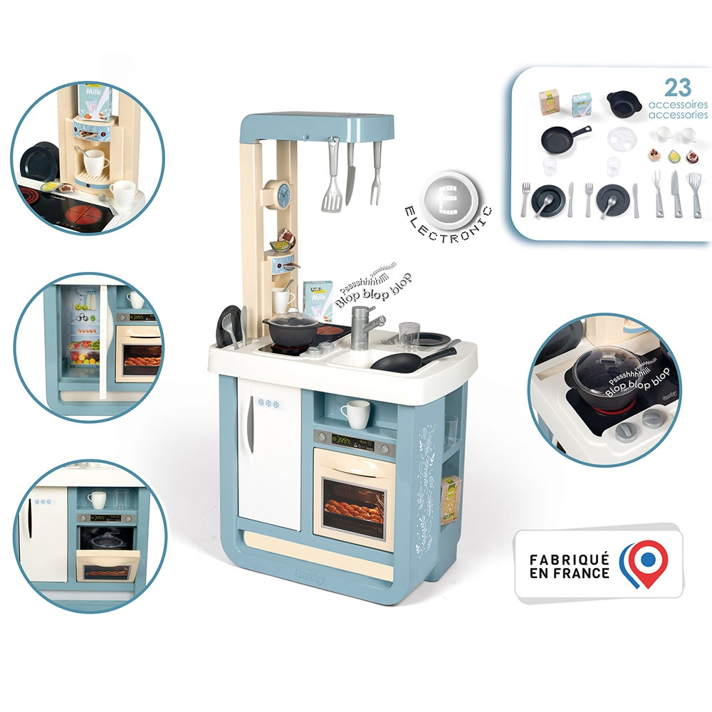 - Bucataria Smoby este dotata cu 23 de accesorii interesante. Printre aceste accesorii se regasesc: frigider la care se deschide usa, cuptor la care se deschide usa, plita (cu sunet specific "Blop-Blop"), chiuveta, expresor de cafea cu pastile, oala, tigaie, si alte accesorii