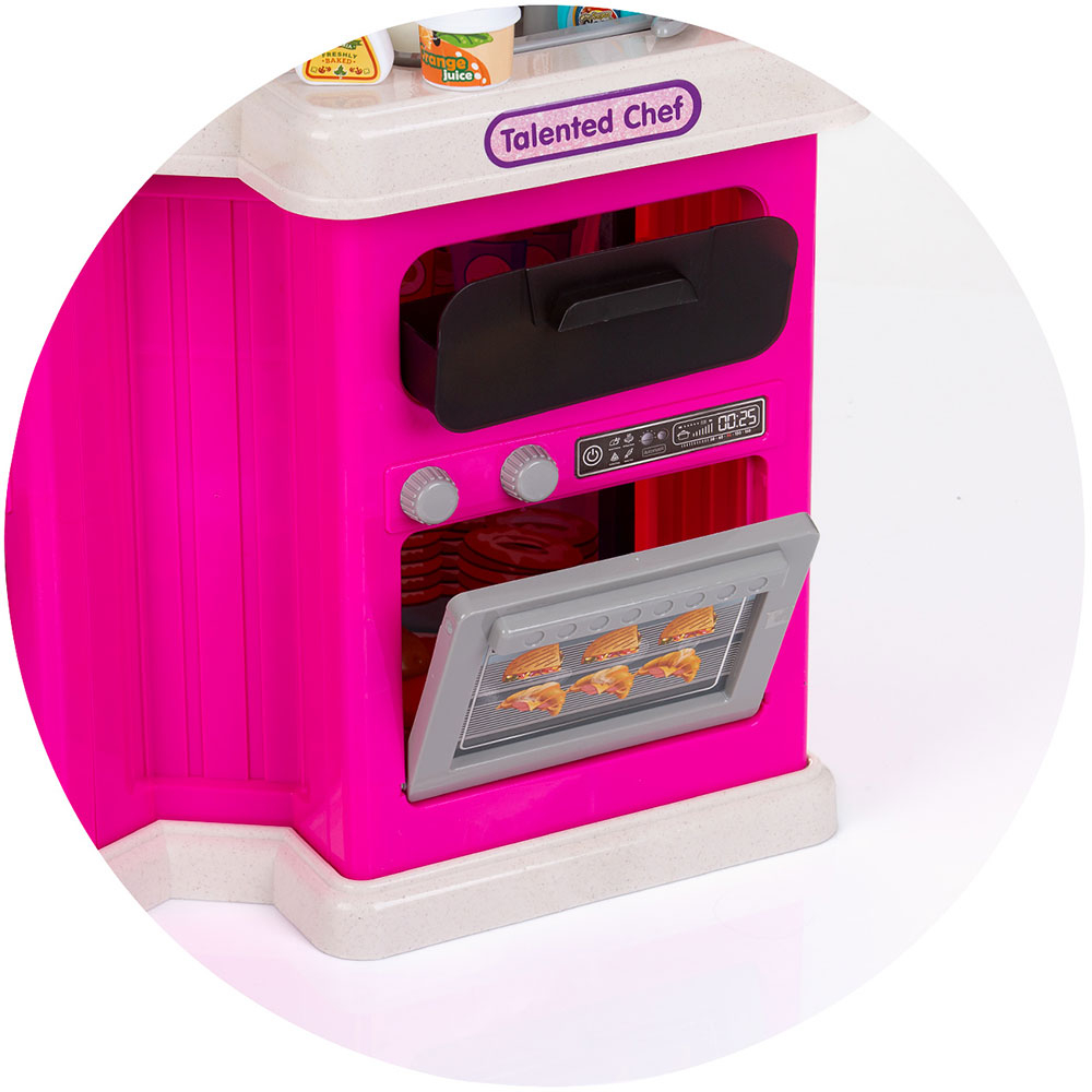 - Setul are diverse efecte realiste - sunete, lumini, efecte de abur si apa curgatoare, cu care copiii se vor distra si vor invata activitati si procese de baza in bucatarie
