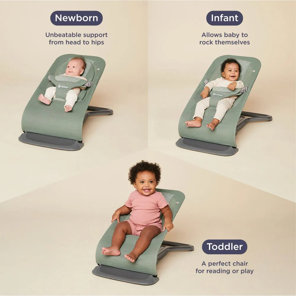 De la un sezlong confortabil pentru nou-nascut...apoi un fotoliu relaxant pentru bebelusi... la un scaun functional pentru copil mic, balansoarul Evolve 3-in-1 Mesh Sage Green este facut pentru a creste impreuna cu micutul tau.