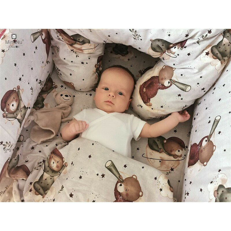 MimiNu Lenjerie patut cu 3 piese, MimiNu, pentru patut 120x60 cm, cu protectie laterala, din bumbac, Teddy Bear On Moon