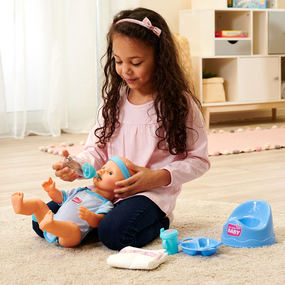 Papusa cu pleoapele mobile. Setul include tot ce este necesar pentru ingrijirea papusii. Poti s-o hranesti, sa-i dai o suzeta, sa-i schimbi scutecul si s-o pui pe olita.