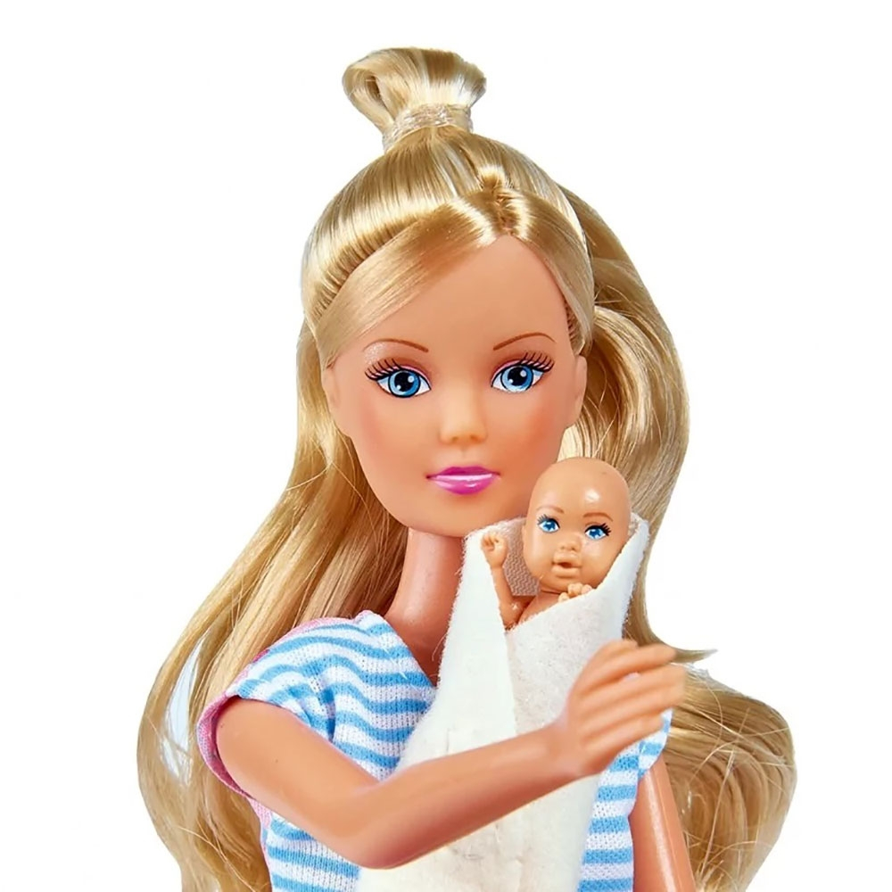 Set compus din: papusa Steffi Love 29 cm, papusa Kevin 29 cm, papusa Evi Love 12 cm, 2 carucioare, scaun de masa, leagan, cantar si cadita si alte accesorii