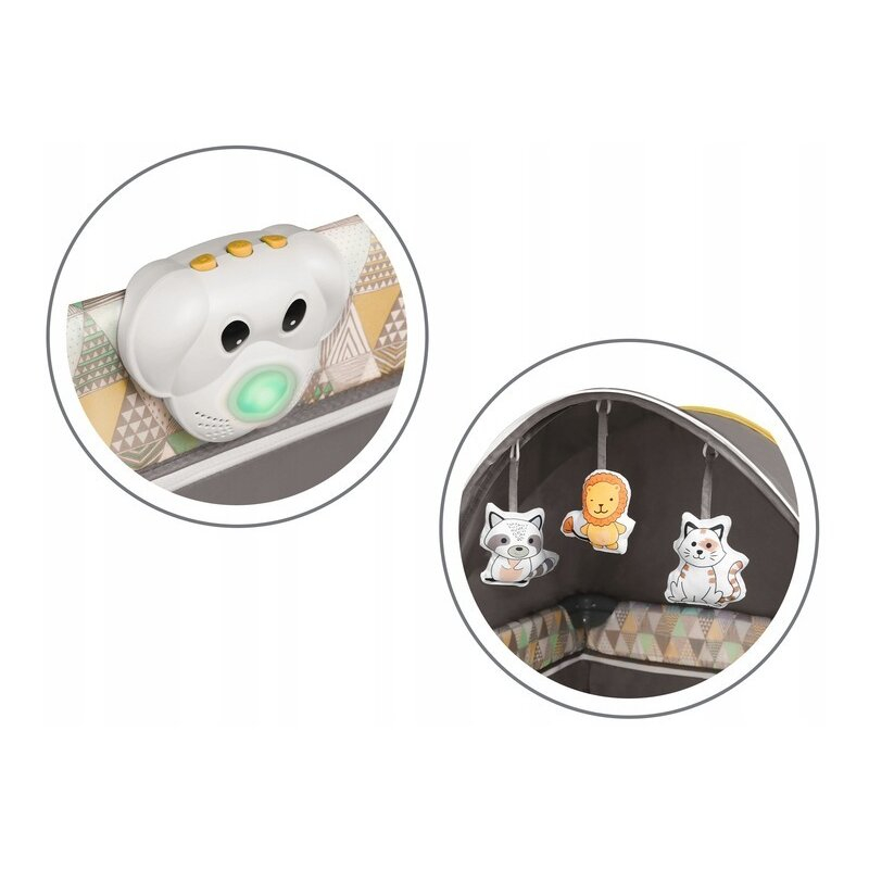 Copertina functionala (cu 3 jucarii captivante) va protejeaza bebelusul de lumina soarelui si de stimuli inutili, iar plasa de tantari inclusa va protejeaza impotriva insectelor. Asadar, patutul de copii poate fi folosit si in aer liber atunci cand temperatura o permite.