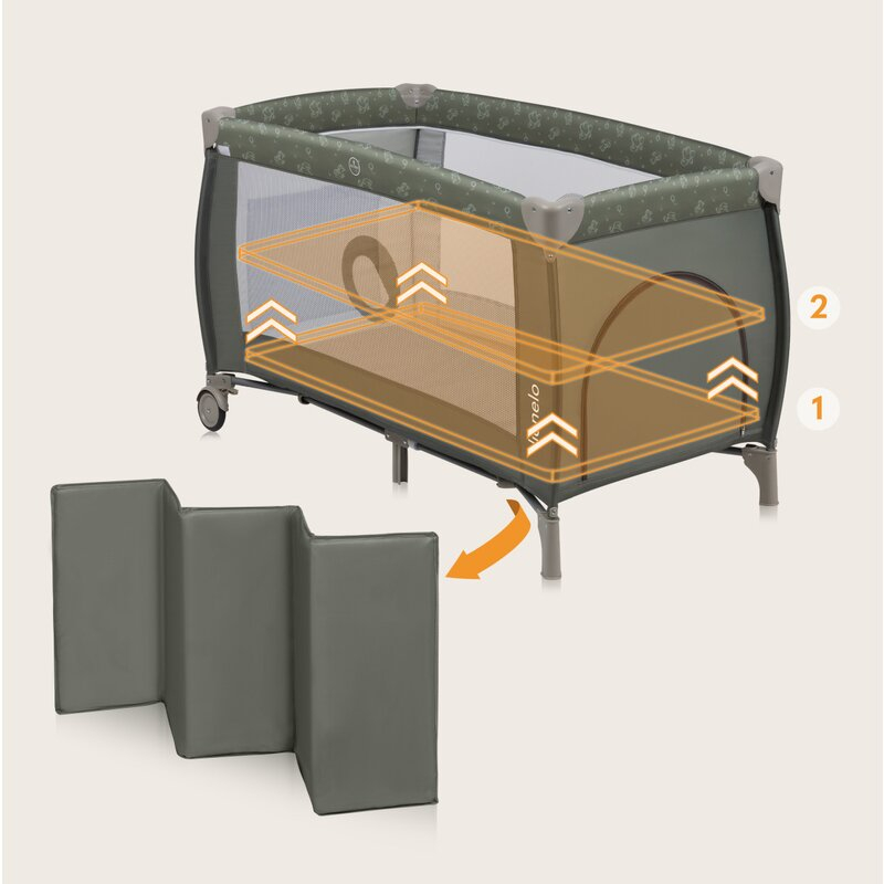 Patut pliant, Lionelo, Sven Plus, 120x60 cm, cu doua nivele, cu arcada jucarii, masuta de infasat, vibratii, melodii, Bej Olive