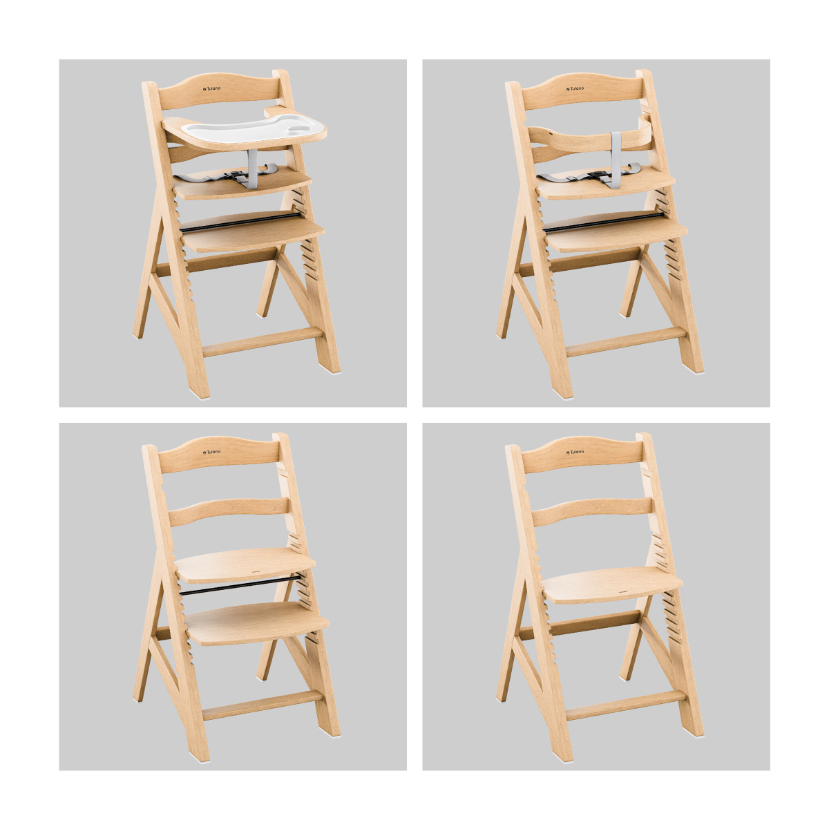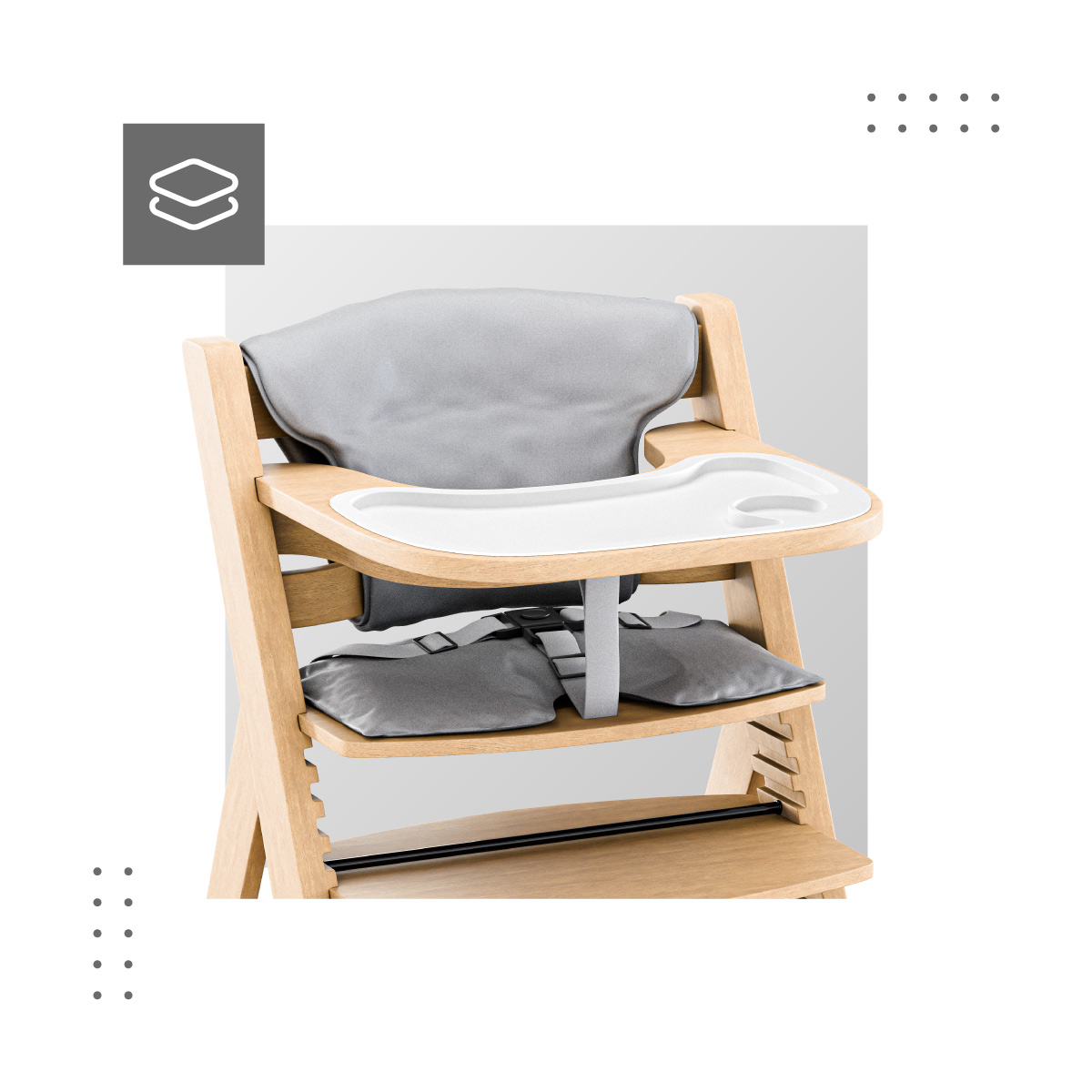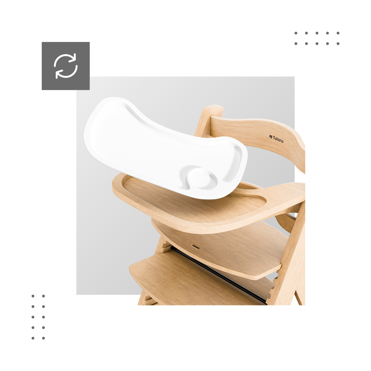 Tavita functionala si detasabila: usor de curatat manual sau in masina de spalat vase. Functionalitatea scaunului de hranire este crescuta de o tavita detasabila cu un capac din plastic. Aceasta solutie este igienica si previne decolorarea care poate aparea pe tavitele din lemn. Marginile ridicate ale tavitei impiedica caderea mancarii. Capac din plastic este extrem de usor de curatat - poti indeparta murdaria minora cu un burete umed, iar dupa masa, pur si simplu il indepartezi pentru a-l spala in masina de spalat vase sau sub apa curgatoare.