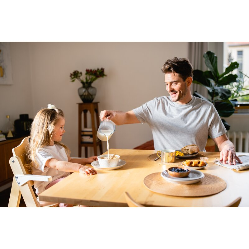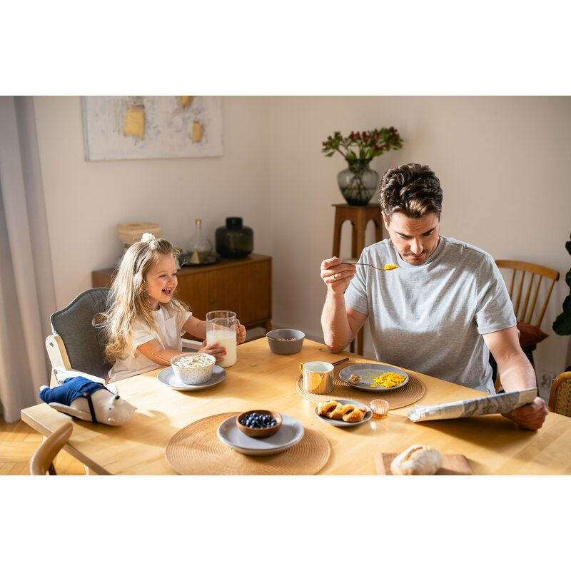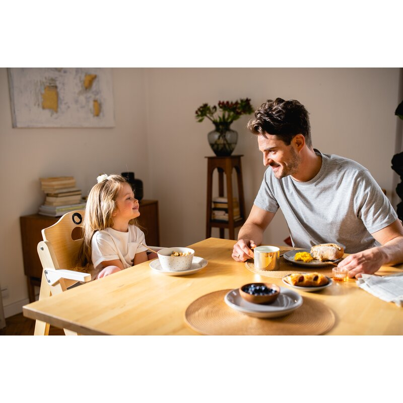 Tava generoasa ofera suficient spatiu pentru mese si activitati, facilitand invatarea hranirii independente. Materialul rezistent permite utilizarea zilnica fara griji.