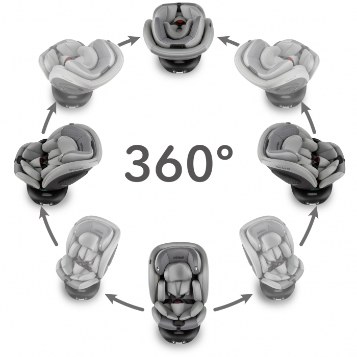 Scaun rotativ la 360grade: datorita functiei de rotatie, scaunul permite pozitionarea usoara cu fata sau spatele la directia de mers si urcarea si coborarea confortabila a copilului din masina.