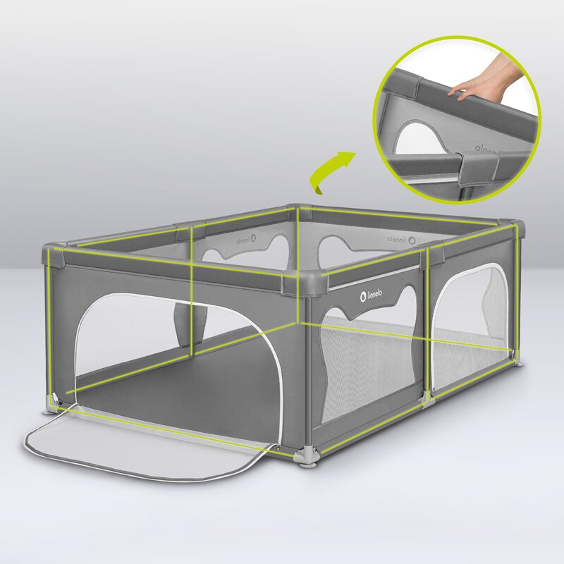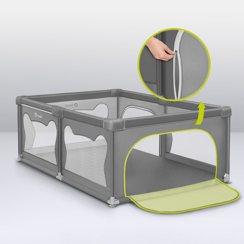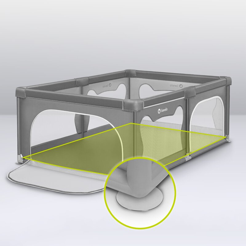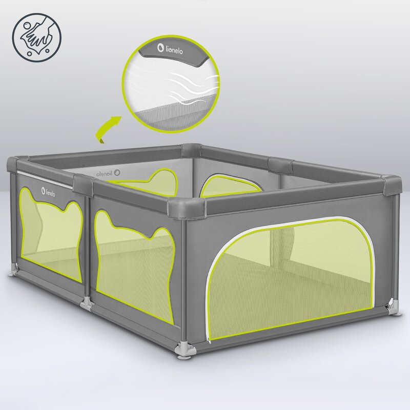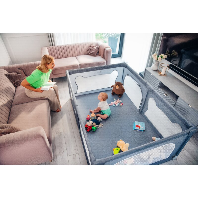 Laturile inalte ale tarcului de joaca sunt realizate din plasa, care nu numai ca asigura circulatia aerului, dar garanteaza si o buna vizibilitate, astfel incat parintele sa poata controla ce se intampla cu cel mic. Partile moi minimizeaza riscul unui posibil impact, iar designul asemanator urechilor de urs incurajeaza copiii sa se joace singuri in interiorul tarcului.